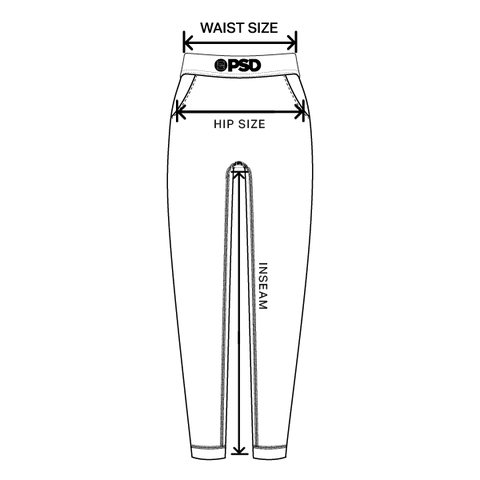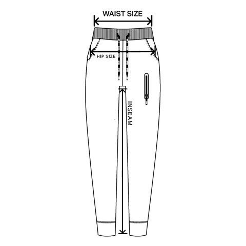 Inseam - Stand with your feet 6” apart. Measure along the inside of the leg from the crotch to below the leg opening.